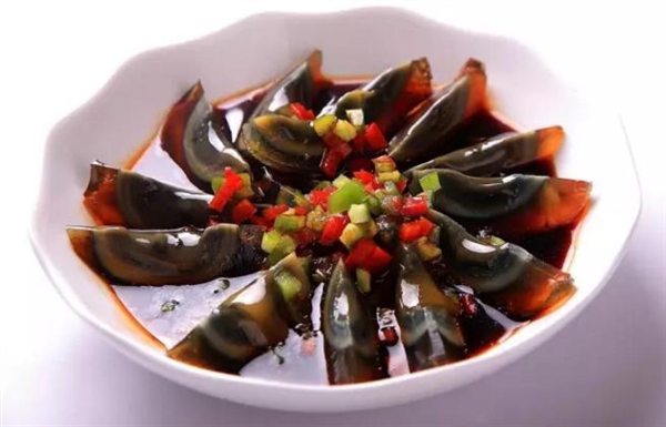 口感鲜滑爽口,色香味均有独到之处。 不但是美味佳肴,而且还有一定的药用价值。经过加工后,皮蛋会变得黝黑光亮,上面还有白色的花纹,闻一闻则有一种特殊的香气扑鼻而来。